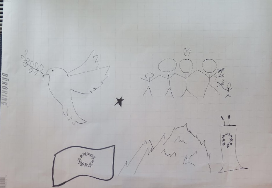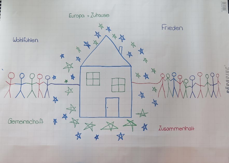 Nach einem spannenden Vortrag zur Bedeutung der EU für uns, waren wir dann aktiv gefragt. Unsere Aufgabe war es in kleinen Gruppen ein Plakat zu erstellen und darauf zu symbolisieren, was wir mit Europa verbinden: Ist es eher ein Zuhause, ein Ort, wo man häufig Urlaub macht, verbinden wir es mit Frieden … – all diese Dinge waren besonders häufig zu finden.